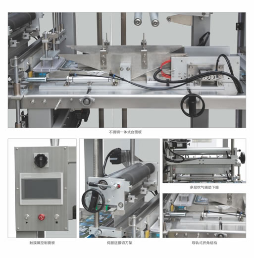 1.本機是一款全自動高速透明膜包裝設(shè)備,采用平推式包裝方式,所有裹包及熱封動作均由四個伺服電機和進口氣缸傳動完成,具有速度快、運行穩(wěn)定等特點。